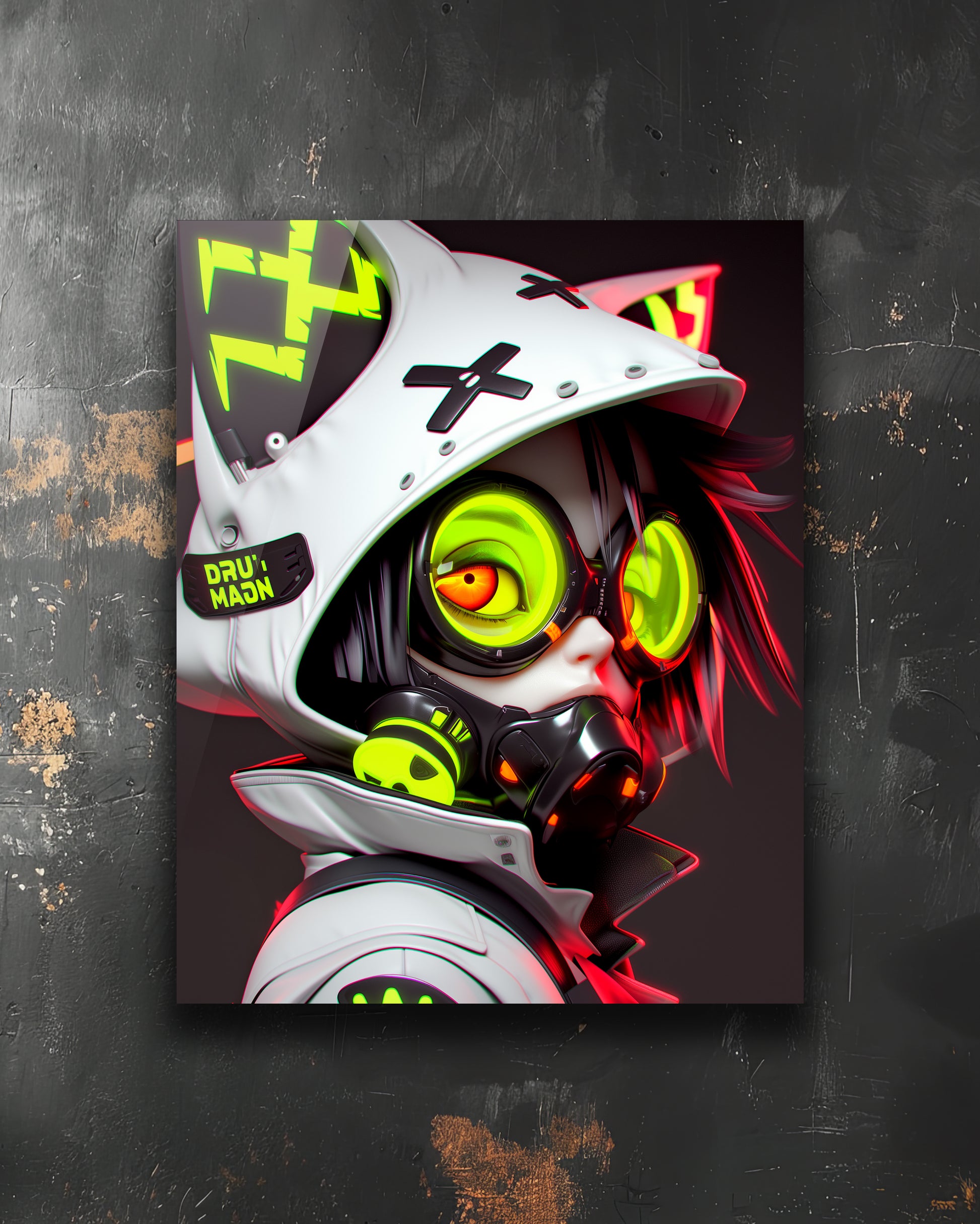 Discover the Neo Pop Cyberpunk Collection, where high-tech futurism meets explosive pop energy. Each piece blends cyberpunk aesthetics with vibrant, neon-infused colors, creating dynamic portraits of characters masked by futuristic accessories like neon goggles and cybernetic helmets. This visual collision of advanced technology and anime/manga culture offers pieces that are both eccentric and captivating.